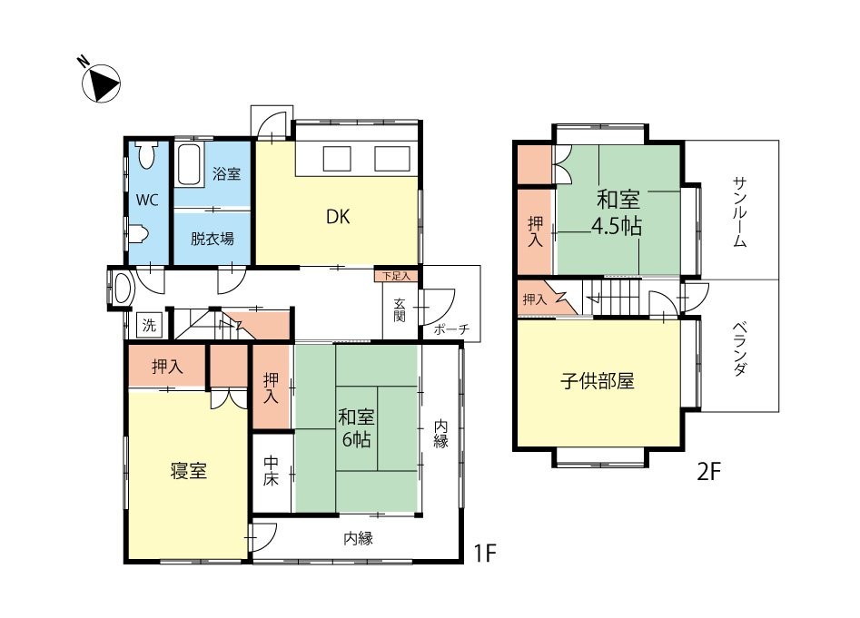 | 詳細間取 | 和室6帖溶質6帖DK・バス・トイレ二階和室4.5帖・溶質6帖・サンルーム・バルコニー | ||