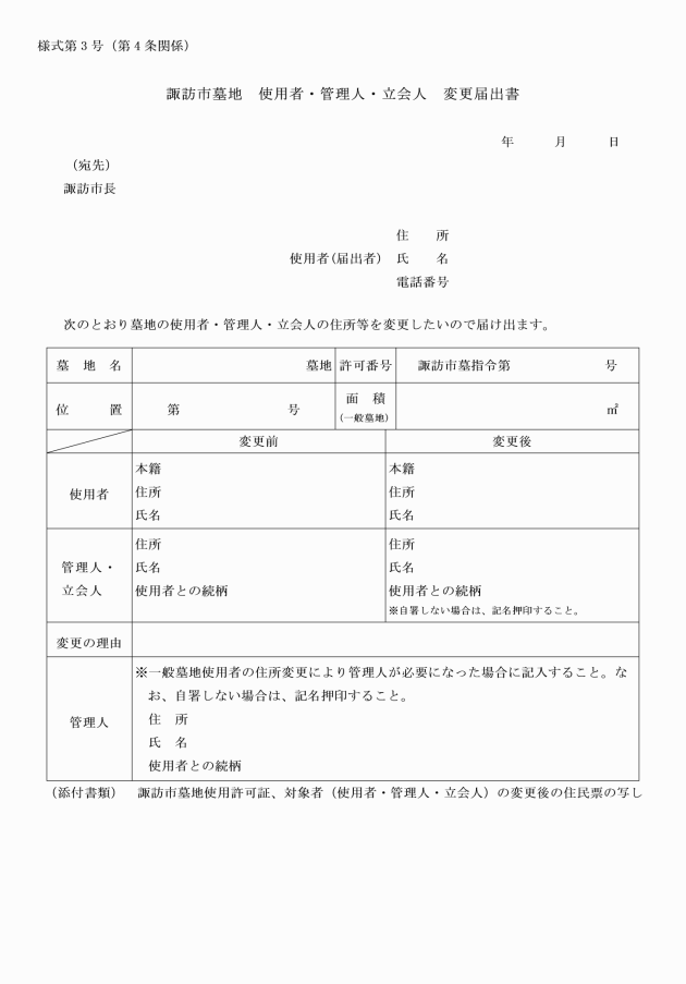 第4条 一般墓地又は合葬式墓地の使用者は、次に掲げる場合に該当するときは、諏訪市墓地使用者・管理人・立会人変更届出書(様式第3号)に変更のあつた者の変更後の住民票の写しその他変更した事項を証明する書類を添付して市長に届け出なければならない。