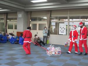 サンタクロースに扮した生徒から、児童センターの職員の方にプレゼントを贈呈。