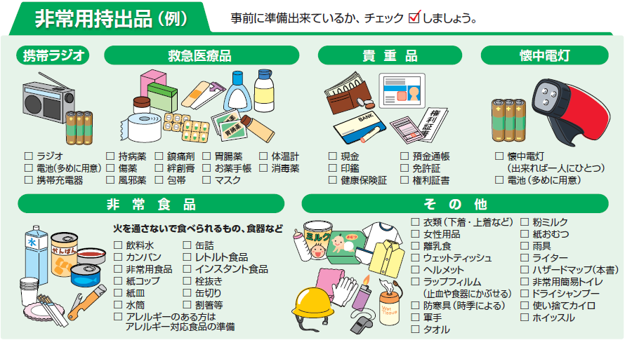 災害時における個人の非常用持出品、非常用備蓄品の備えについてお知らせします。