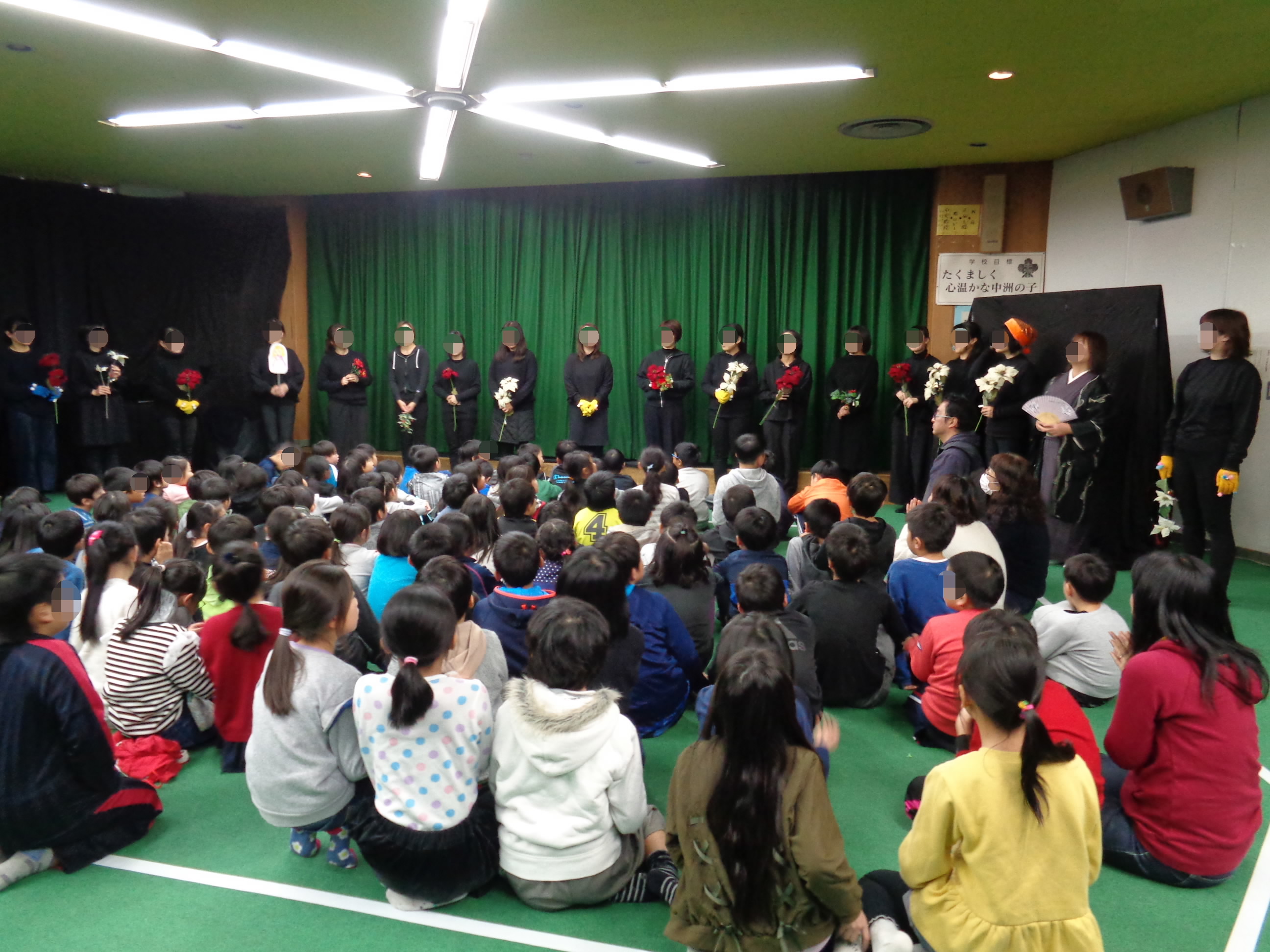PTA親子文庫の皆様と読み聞かせボランティアの皆様によるお話会が行われました。各学年1時間、学年に応じて内容を考えてくださって計6回公演です。3時間目の3年生には、まず手品の披露、ペープサートで「おむすびころりん」や「金の斧銀の斧」、「もちもちの木」のOHP読み聞かせ等々、子どもたちが飽きずにひきつけられる内容でした。何回も集まって練習を重ねていただき、感謝です。一足早いクリスマスプレゼントにもなりました。