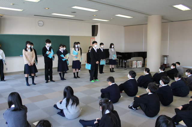 1年生に向けて、校友会役員の3年生が説明しました。堂々と説明する3年生から、学校を動かしていく立場への自覚が感じられました。 また、先輩の姿を真剣に見て、内容を聞き漏らさないように集中している1年生の姿も見ることができました。