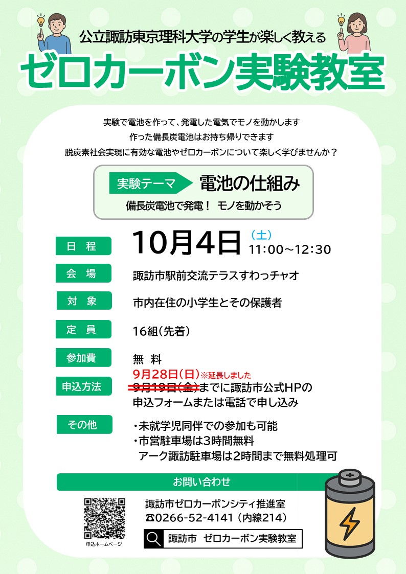 当日は8組の家族が参加し、公立諏訪東京理科大学の学生の皆さんが丁寧にサポートしてくれました。子どもも大人もみんながゼロカーボンに関心を持つことがゼロカーボンシティ実現につながります。実験教室はその関心を生む貴重な機会になりました。