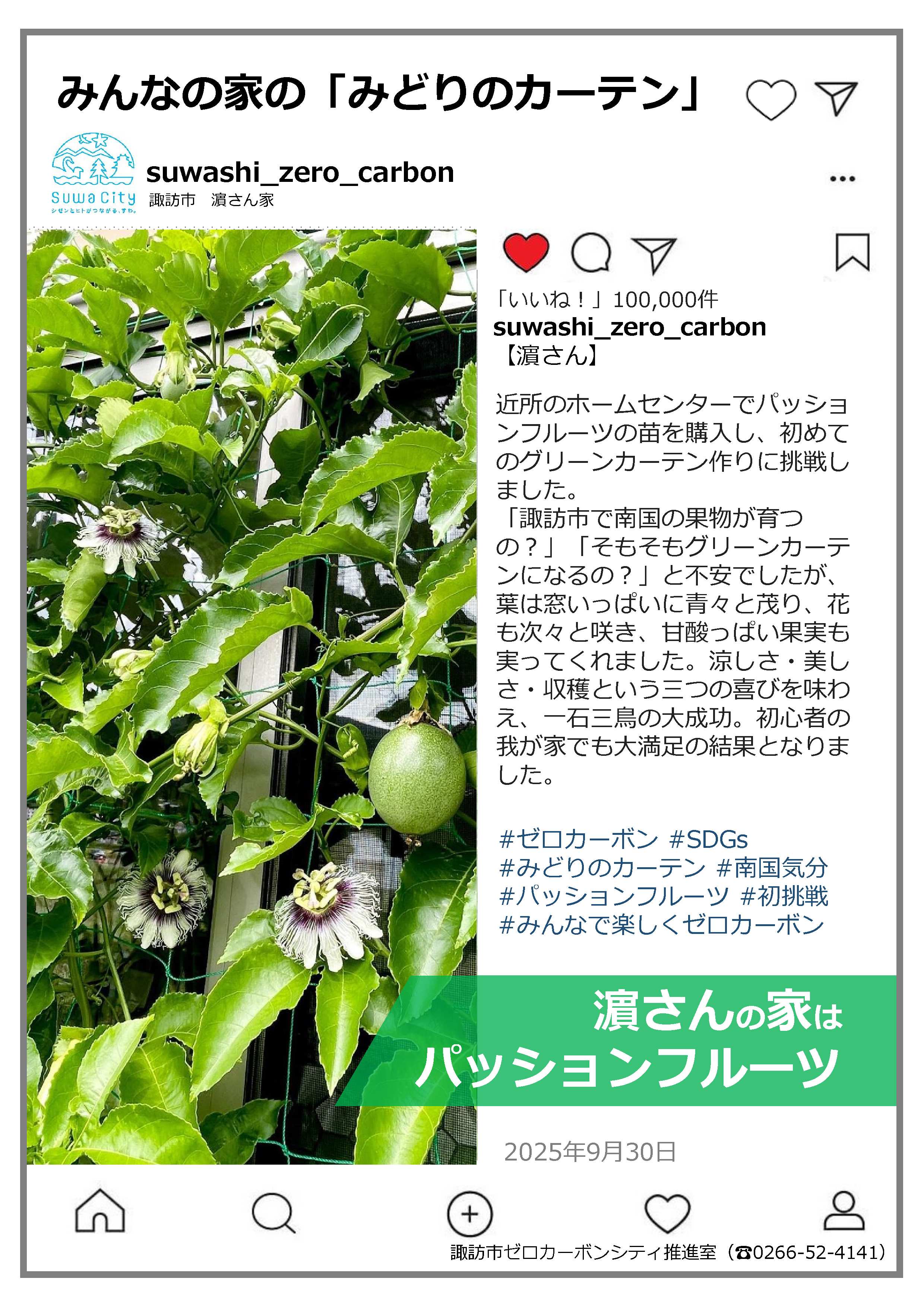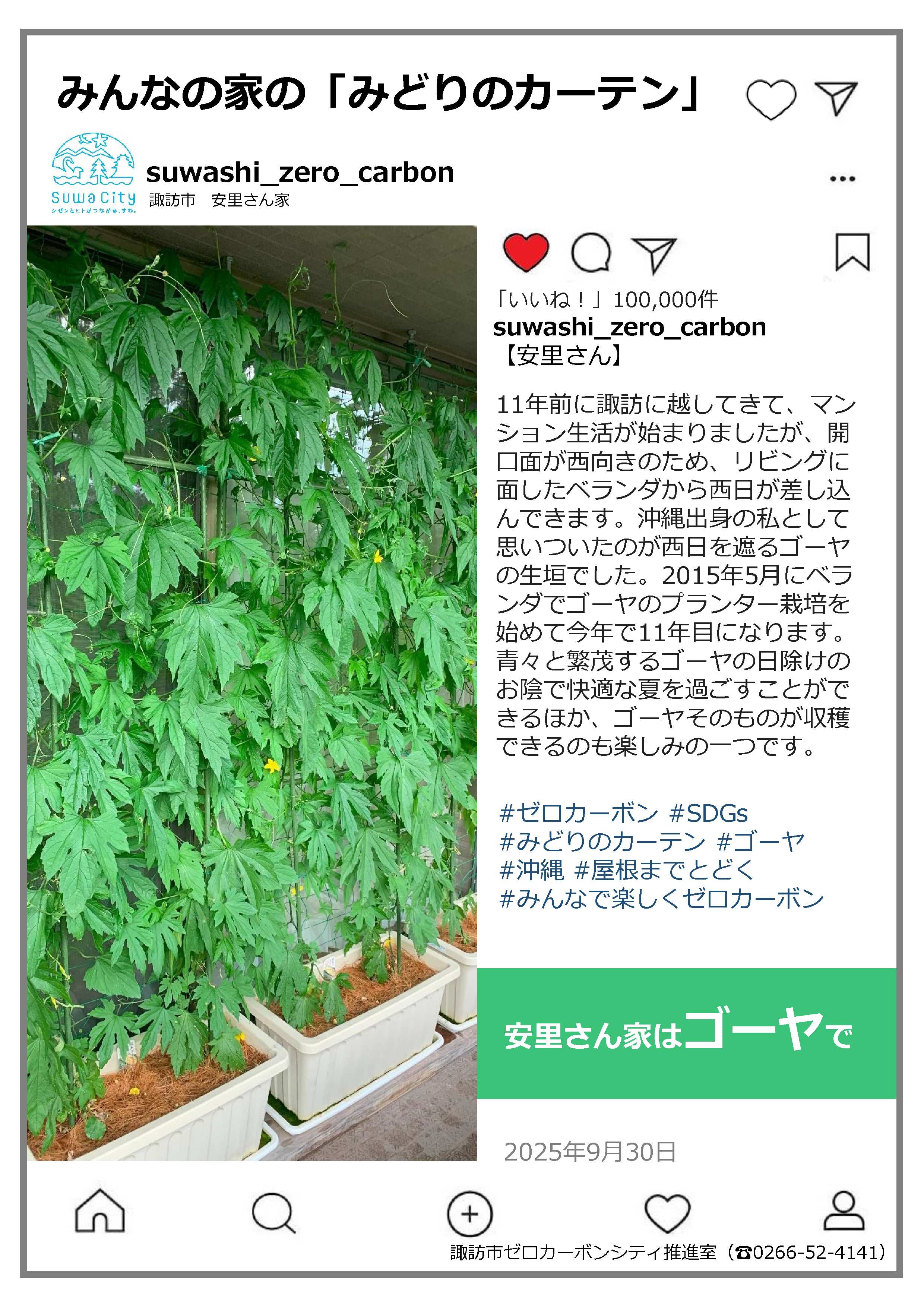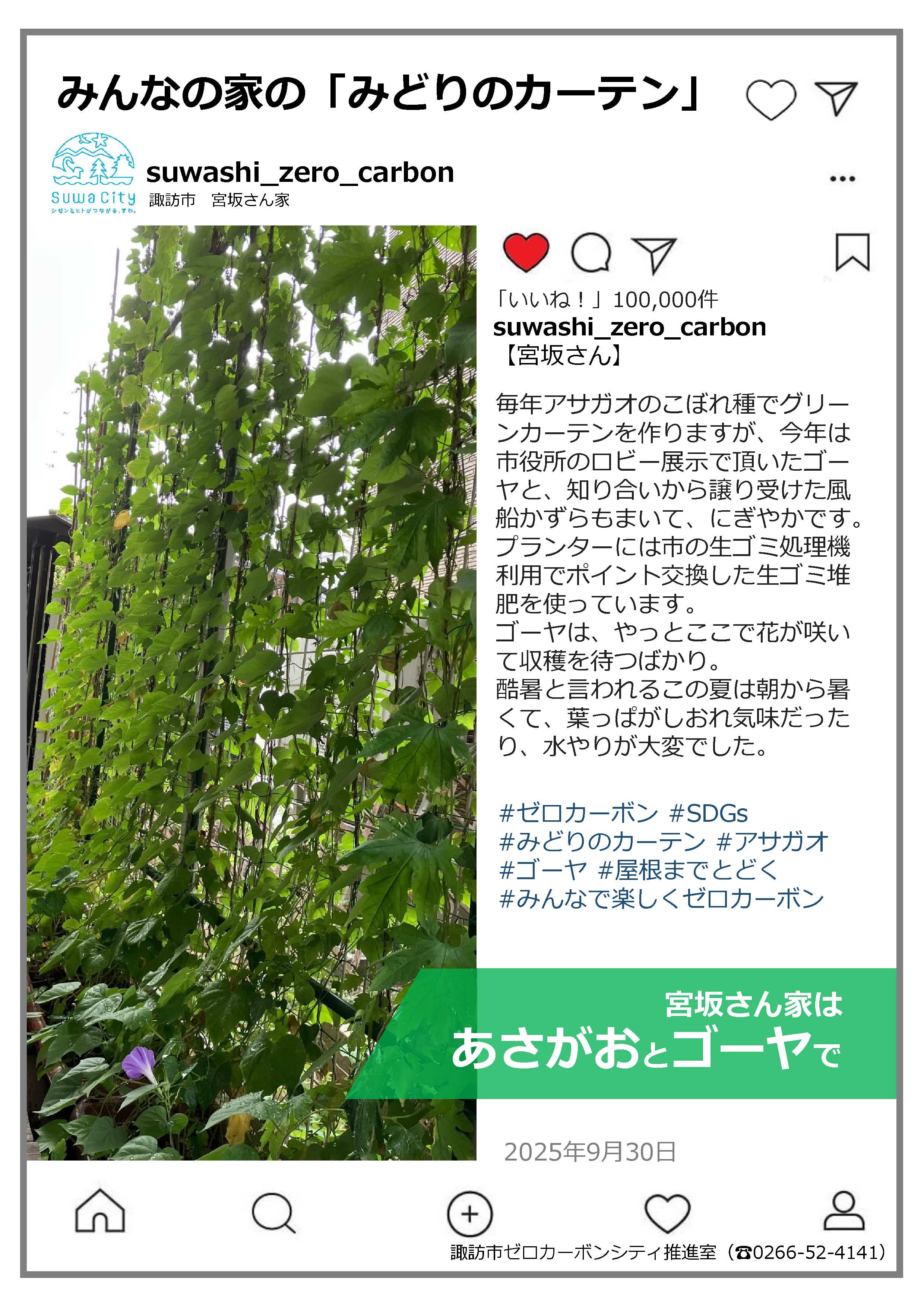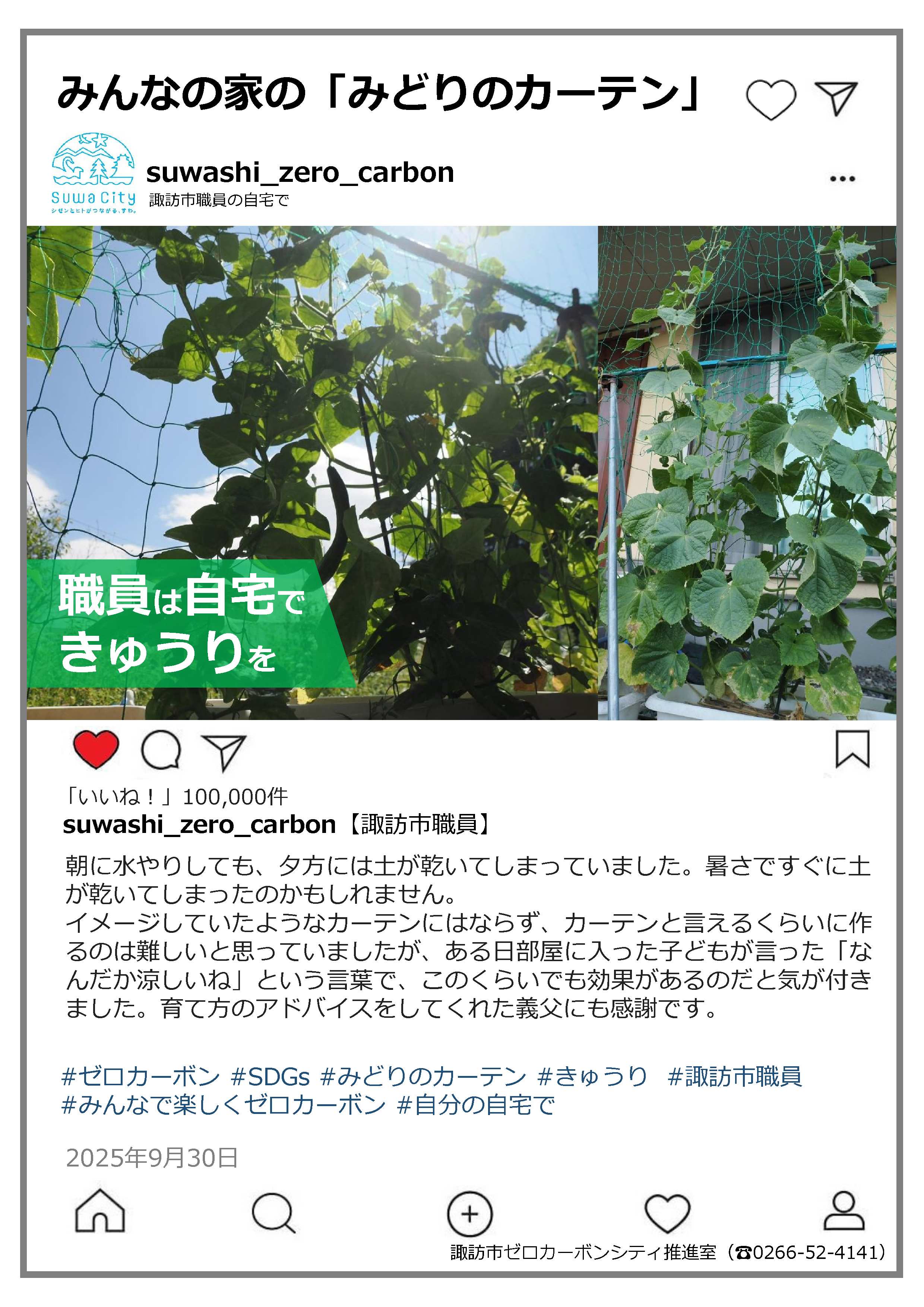 つる系植物を育てるとカーテンのように日射しを遮ることができる。夏の厳しい日射しをこれで遮る取り組みが「みどりのカーテン」です。誰もが気軽に始めることのできるこの取り組み。皆さんの実施した「みどりのカーテン」の写真や感想を募集し、令和7年度は7件の応募がありました。ご応募いただきありがとうございました。