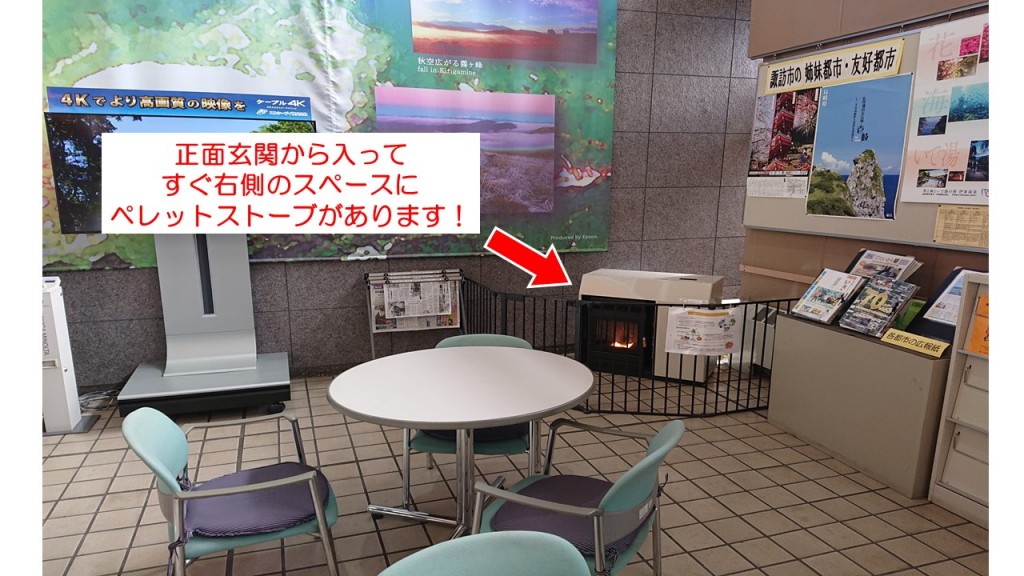 市役所の1階のロビーにペレットストーブが導入されています。ペレットストーブがどんなものなのかご覧になりたい方は、ぜひ一度お越しください!