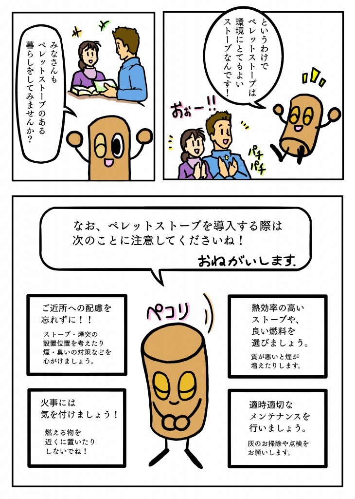 「ペレットストーブ」は、木くずや間伐材などを粉砕・乾燥・圧縮して粒状に成形した”木質ペレット”を燃料にしたストーブです。ペレットストーブのあるくらしをしてみませんか?まずは下のマンガからご覧ください。