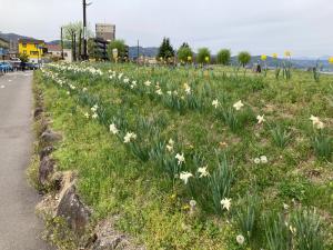 上川の土手にほぼ同じ時期に咲く桜とスイセンの色の共演はたいへん見事な眺めです。