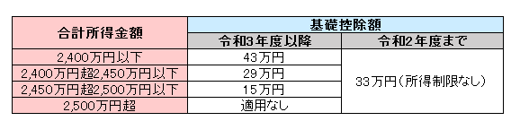 - 納税義務者の前年の合計所得金額が2,400万円を超える場合、その合計所得金額によって基礎控除額が逓減し、合計所得金額が2,500万円を超える場合は、基礎控除の適用がなくなります。(下表参照)