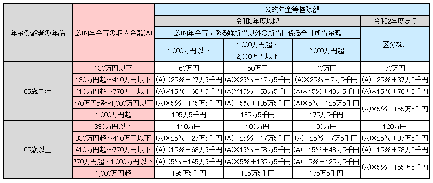 - 公的年金等の収入金額が1,000万円を超える場合の控除額は195万5千円が上限となります。