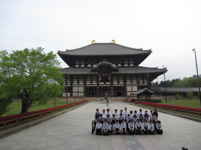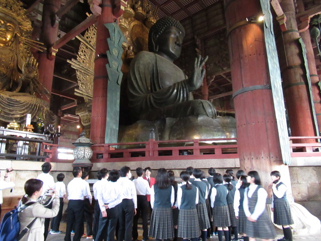 大仏殿の壮大さに驚かされ、中に入ると大仏の大きさに圧倒されました。公園ガイドさんのお話を聞きながら、建物内の柱にある穴(大仏の鼻の穴と同じ大きさ)をほぼ全員の生徒がくぐり抜けました。穴を通り抜けられれば、厄除けのご利益があるとか・・・。ガイドさん曰く東大寺の人気アトラクションで、混んでいるときは1時間待ち。こんなにすいている状態はない。ということでした。