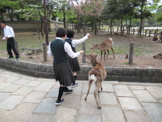 奈良公園の鹿に鹿せんべいをあげました。行儀よく食べさせられる生徒もいれば、追われて逃げ回る生徒もいました。