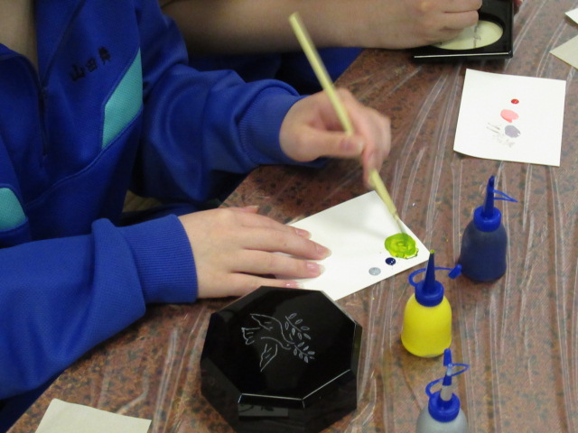 夜は漆塗りのペン立て・小物入れ・写真たてなどに、絵をかき色を付けました。この作品は文化祭で展示しますので、ご覧ください。