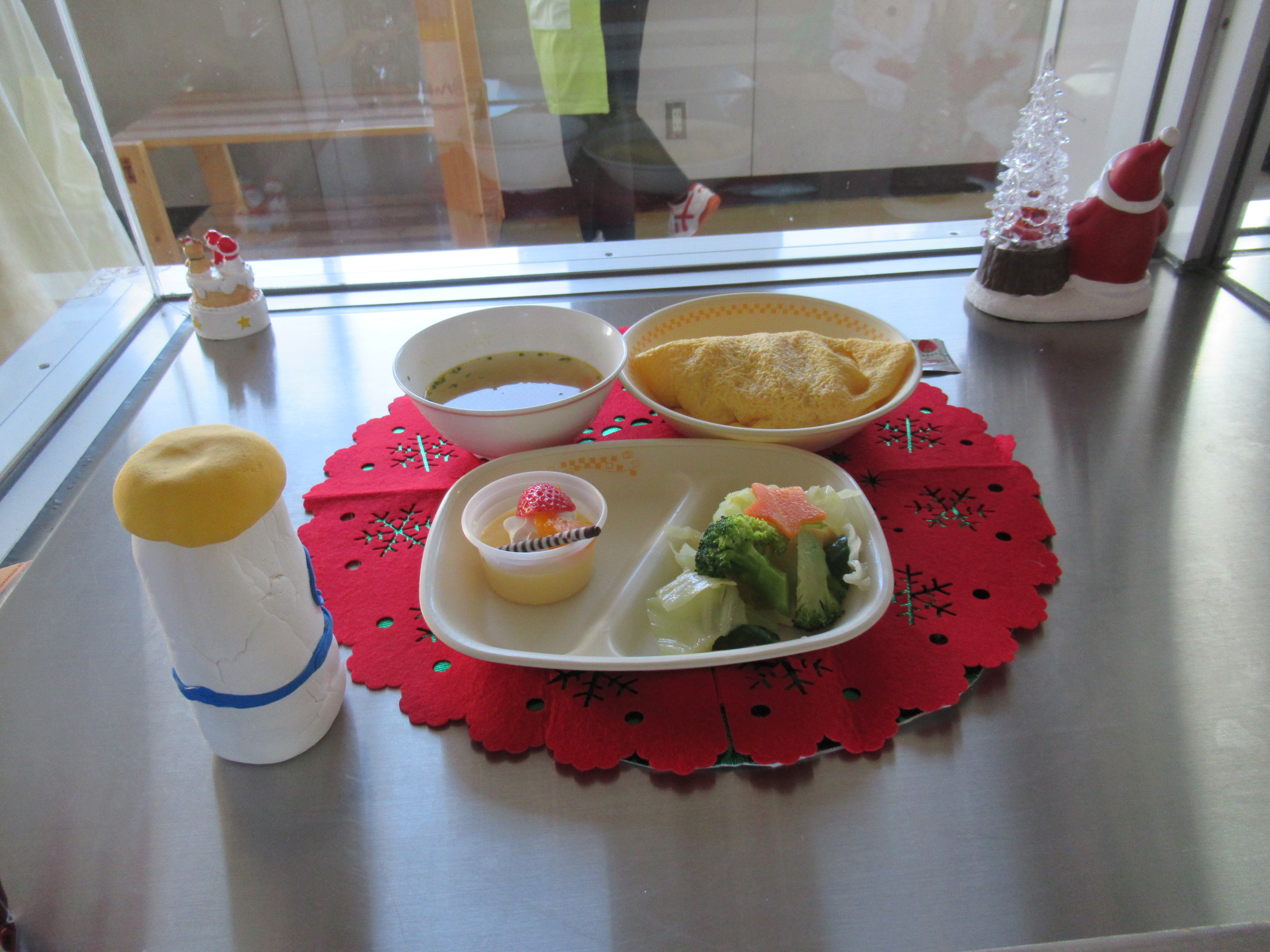 今日のメニューはセルフオムライス、クリスマスサラダ、ジュリアンスープ、クリスマスデザートです。