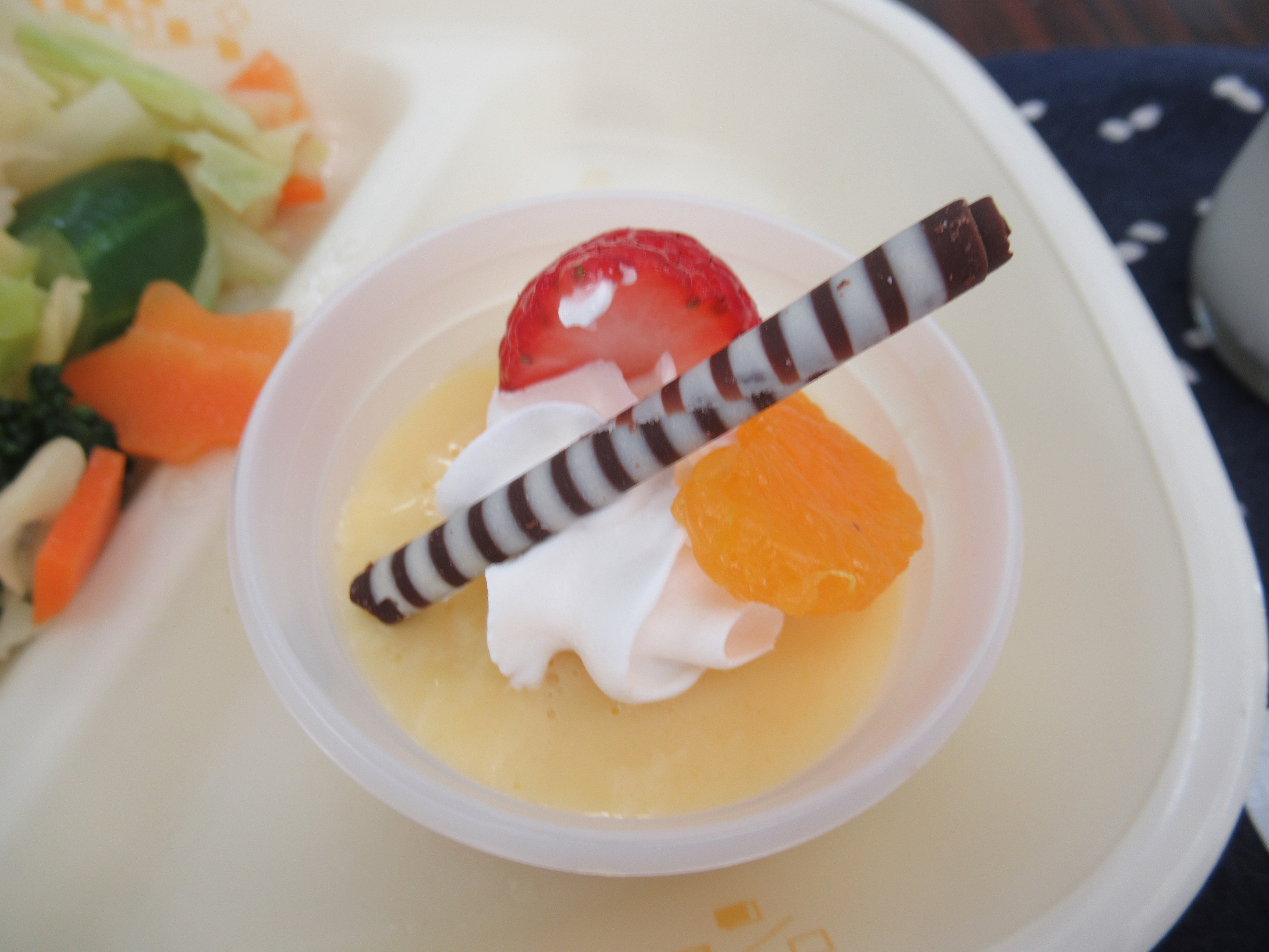セルフオムライスは、チキンライスを自分でくるんでオムライスにしました。クリスマスサラダには、星型のニンジンが入っていて、クリスマス感を出していました。デザートのプリンはとてもおいしかったです。